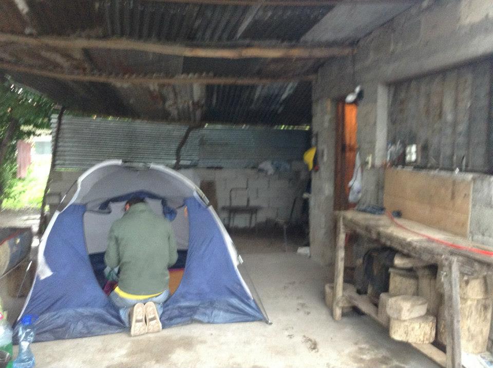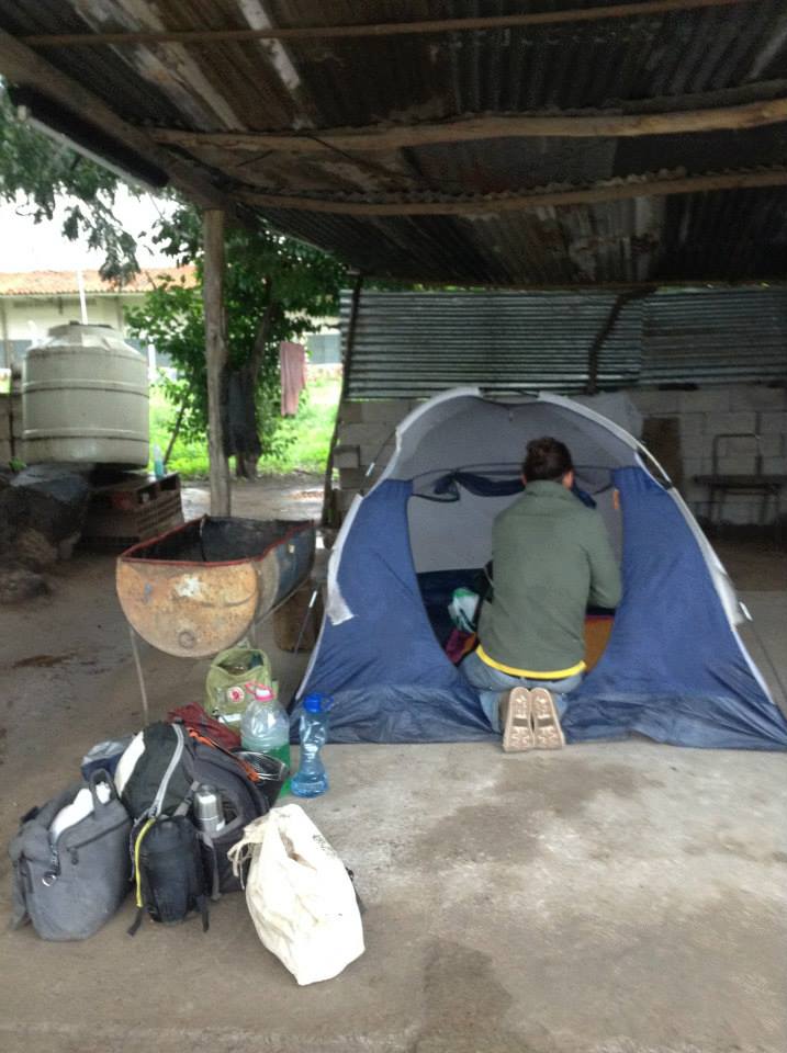Raúl me dice, “Ya sé adónde vamos.” Dice que vamos a armar la carpa. “¿Pero dónde?” le pregunto. Sólo hay casas acá, ningún lugar para escondernos. La lluvia continúa, las luces de la noche brillan. “Ya vas a ver.” Caminamos un rato hasta que encontramos una casita pobre al lado de la calle. Hay un patio chiquitito con un techo, una puerta vieja de madera, entreabierta, y música cumbia que toca con volumen muy bajo, la única señal de vida. “Estamos acá, maestro!” grita Raúl suavemente, y empezamos a armar la carpa en este patio chico de un hombre desconocido.