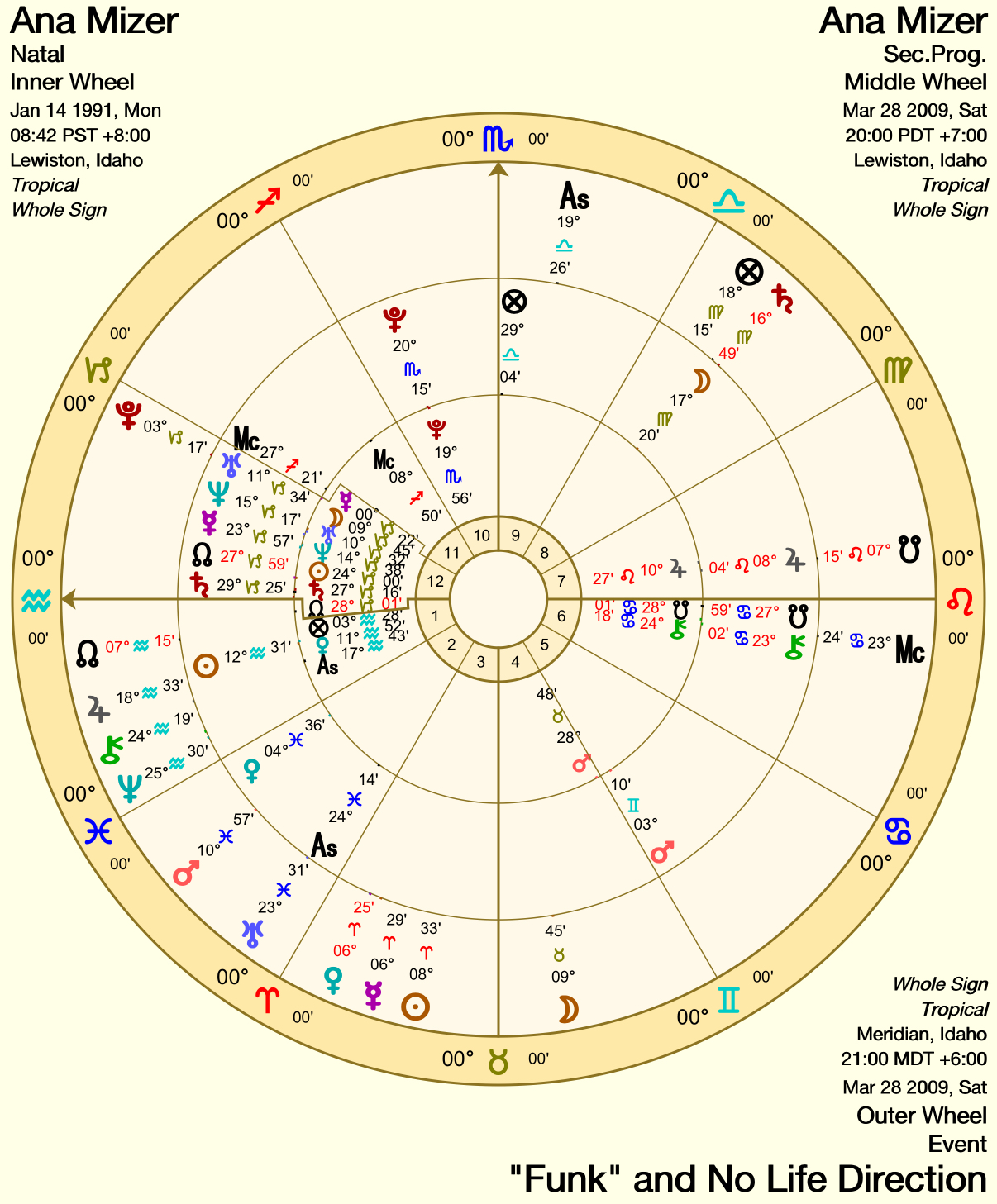 [Another chart with Ana’s secondary progressions. You can see Saturn and her progressed Moon just separated from the degree-based conjunction. It’s so interesting to me that Uranus is right on her progressed AC, both closely sextile/trine the core axis of her chart. How do you interpret such a thing? Does her mention of “crazy shit,” “random phenomena,” and “spontaneity” speak to this? Maybe if the transit chart was an exact time, the AC or MC would be aspecting Uranus and her progressed AC. We’ll never know.