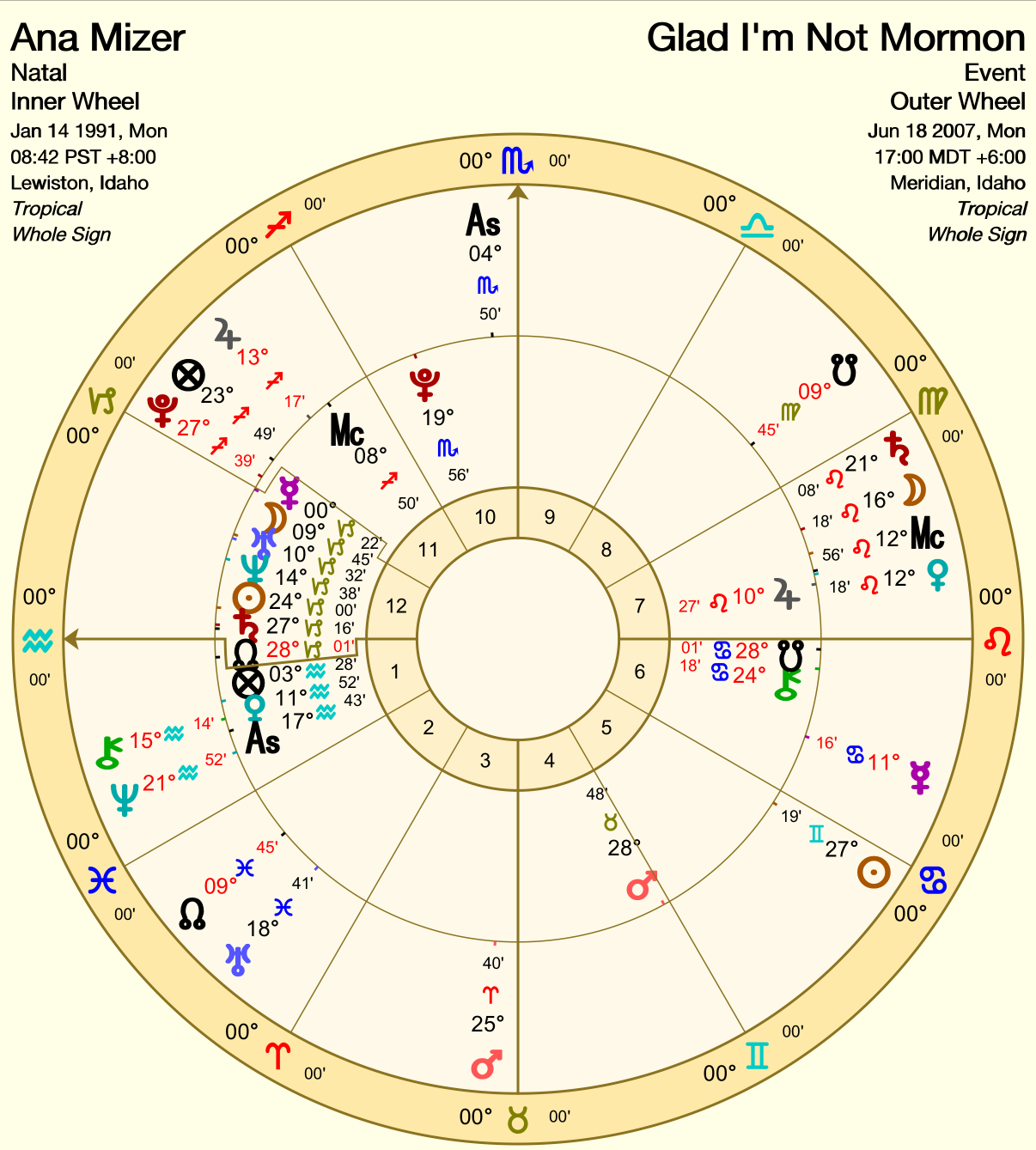 The Mercury retrograde stuff is interesting and I wonder if it ties into this Mormon stuff. Ana’s suddenly like, hang on, I actually think your religion is fucking stupid! I’ve been catering to you about it for my whole life, playing along with your delusions and putting up with all your weird, closed-minded beliefs and prejudices, and I actually don’t want to do this anymore! Mercury is also hitting the nodal axis very closely, which is itself hitting Ana’s Moon by degree at this point, and in this chart it’s literally exact to the arc-minute (I think that’s how you use that term?). What are your thoughts on this? Is it Mercury retrograde and nodal stuff? Or is it something else, maybe all the action in her 1st and 7th? Ana’s always felt kinda irritated and held back by Jenna and Karly being Mormon, but this is the first time she goes into any real depth about it.]