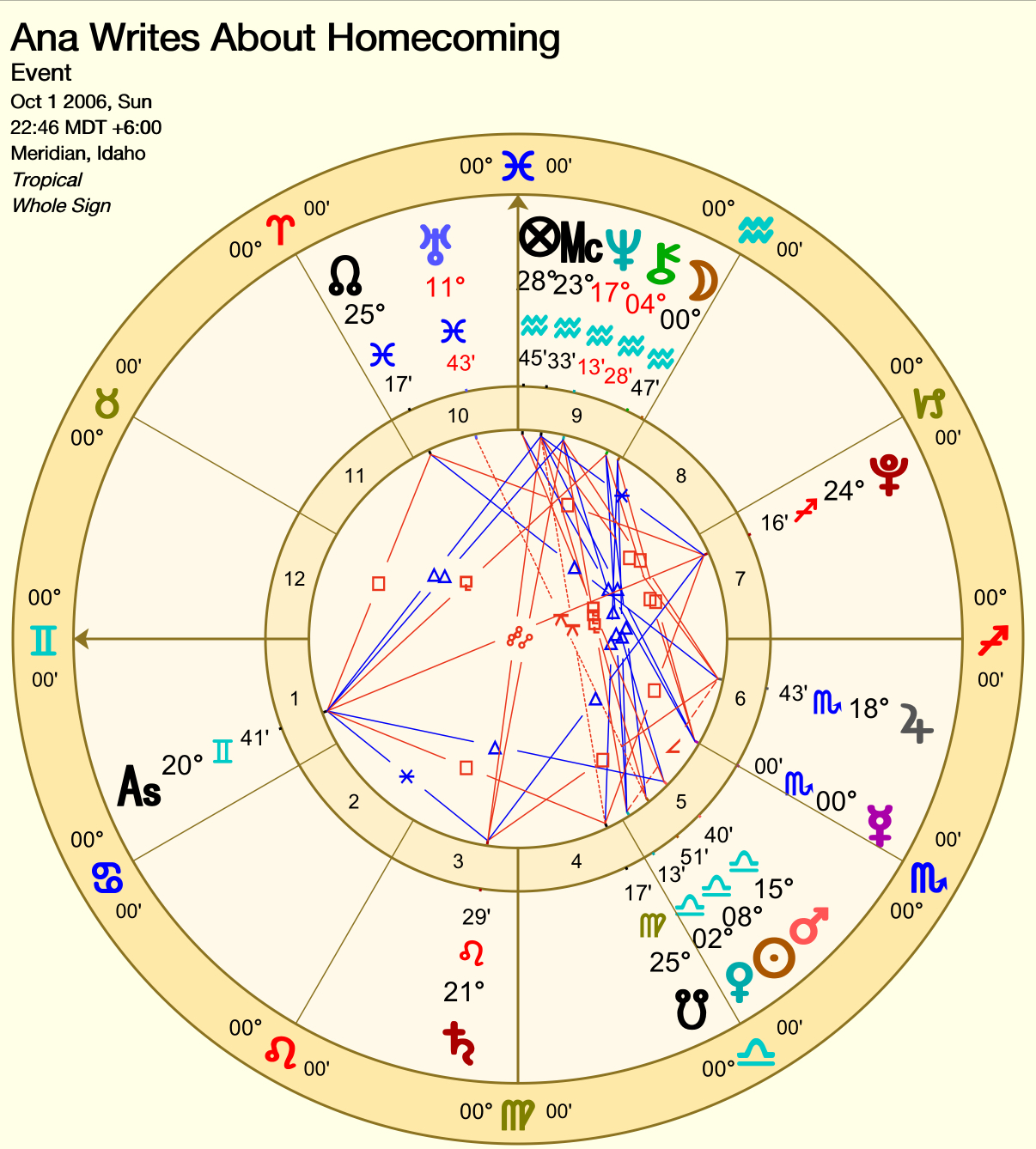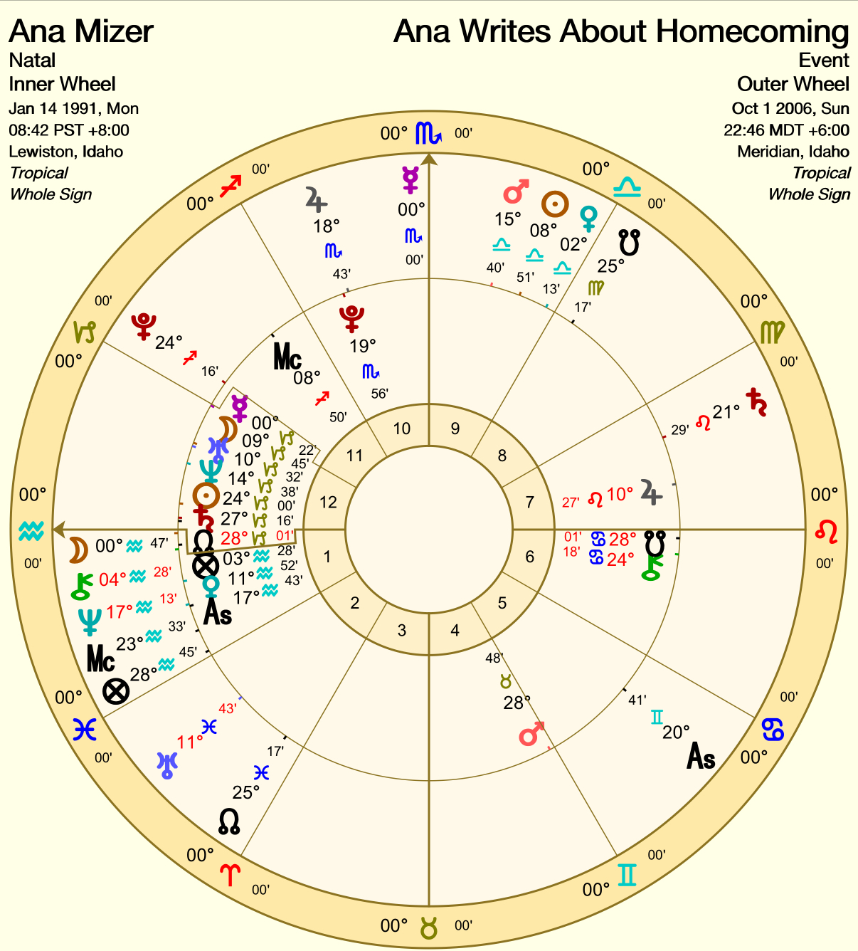 If we wanted to look at the chart of the night of the dance, it would have been either Friday night or Saturday night, in Lewiston, Idaho. The Moon would have been in Capricorn hitting all Ana’s 12th house planets, and Venus would have been at the end of Virgo or the first degrees of Libra, trining/sextiling the core axis of Ana’s chart.]