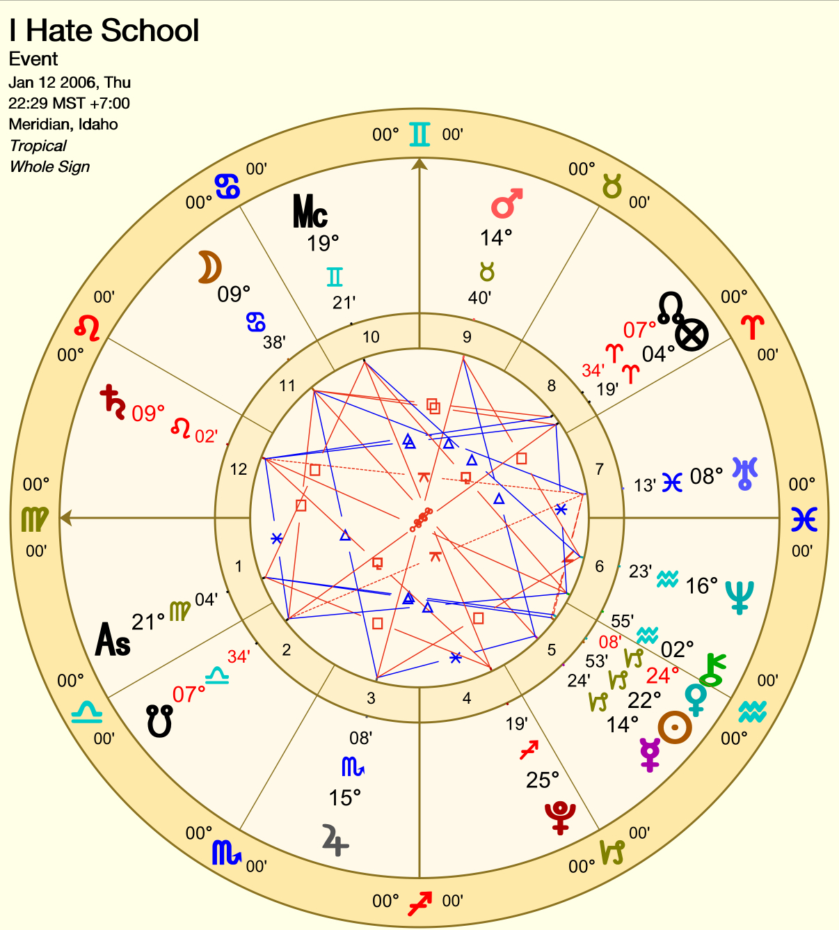 [AC is 21° Virgo trine the Sun-Venus retrograde conjunction in Capricorn and square Pluto in Sag. Venus turned retrograde on December 24 at 1° Aquarius conjunct Chiron. Ruler of the AC is Mercury at 14° Capricorn trine Mars at 14° Taurus, sextile Jupiter at 15° Scorpio, and more widely opposite the Moon at 9° Cancer. The Moon squares the nodes and trines Uranus. Jupiter and Mars are tightly opposed. MC is 19° Gemini trine Neptune in Aquarius.]