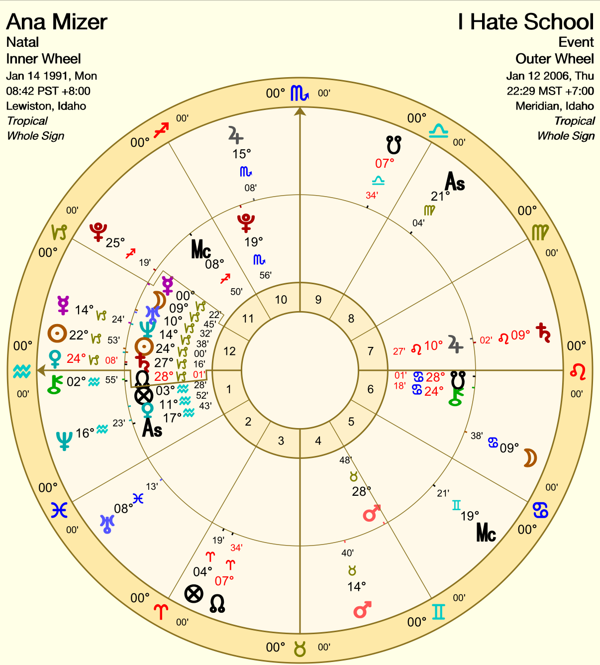 [I think it’s super interesting that the Sun-Venus retrograde conjunction is right on Ana’s Sun, and the AC of the moment she started the entry trines that conjunction. Venus went retrograde on Ana’s Part of Fortune (POF) in Aquarius. I feel like it speaks to how she’s realizing that her “friends” aren’t actually that great of friends, especially with the 12th house emphasis (plus her ruler of the 7th is the Sun in the 12th where the transiting Sun-Venus retrograde conjoin). Mars trines Mercury on her Neptune while transiting Neptune is more tightly conjunct her AC. The Moon opposes her Moon by degree, the MC trines her AC, and Saturn retrograde is still closely conjunct her Jupiter in the 7th. Transiting Jupiter approaches a conjunction with her Pluto, thus squares her AC and transiting Neptune.