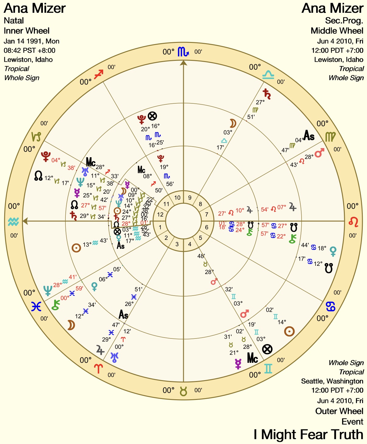 [There’s that whole thing again, where Ana brings up her diary/book idea…Ana has been working on this Artist’s Statement document for her class for quite awhile at this point, and today is the day she turned it in. My profection lord theory is supported by this chart. Even though Ana didn’t necessarily write this today, I think it’s notable that she turned it in today. You can see Mercury as profection lord is applying to aspect by trine/sextile Ana’s Sun-Chiron opposition, and thus the core axis of her chart. Other than that, not much is different from the previous chart shown, other than the Moon’s placement. Moon is now in Pisces sextile/trine the nodal axis by degree, thus sextiling Ana’s Moon-Uranus-Neptune and also squaring the Sun. Is there anything about the transits here that you find particularly notable with respect to Ana’s existential themes?]