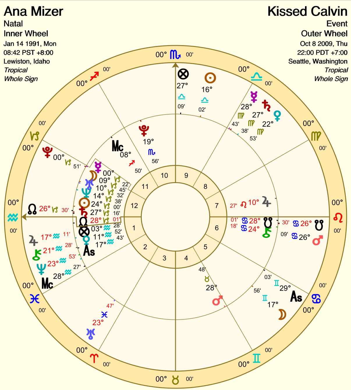 [I don’t know what time Ana kissed Calvin but it was probably after 22:00. What’s interesting is that there’s a grand air trine between Jupiter retrograde, the Sun, and the Moon, with Jupiter conjunct Ana’s AC and the Sun and Moon tightly trining it. Venus is trine/sextile Ana’s Sun-Chiron opposition. Mars conjoins the SN by degree, both tightly conjoined Ana’s natal SN.