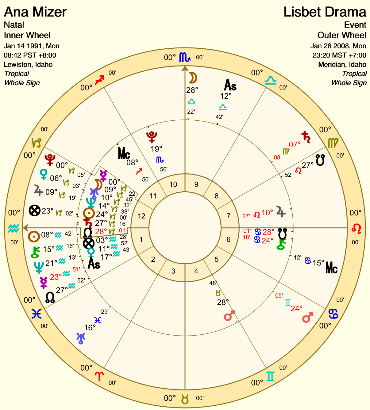 [There’s a lot of interesting stuff in Ana’s transits. First, the AC of the moment is trine her Venus within a degree (thus also sextile her Jupiter), and also trine Chiron which is still within orb of a conjunction with her Venus. Venus and Jupiter are conjunct her Moon, Jupiter by degree. Transiting Moon is square the core axis of her chart. Mercury turned retrograde while conjunct Neptune, both close to Ana’s AC. The Mercury-Neptune stuff is also relatively close to the NN at this point, Mercury being about four degrees away. Mercury is within orb of a square to her Mars as well, and the nodes are still tightly square her Mars. The Sun is applying to conjoin/oppose Ana’s Venus-Jupiter and is sextile by degree her MC in Sag.